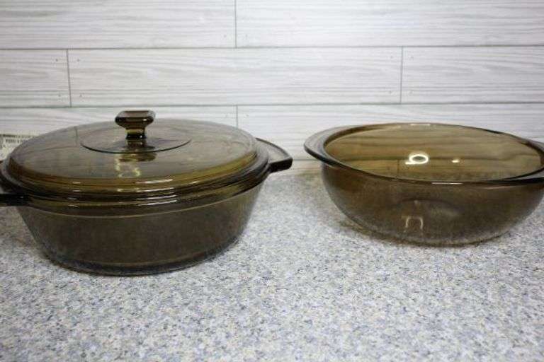 LOT 392 - Anchor Ovenware Smokey Amber Casserole Dish with Lid and PYREX F26 Baking Dish W6