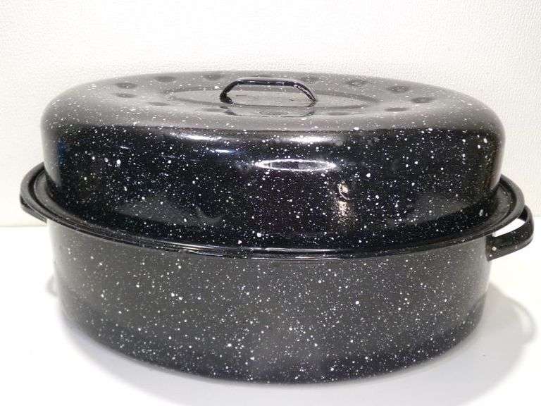 LOT 118 - Vintage Enamelware black/white oval roaster oven with lid 19"x14"x8"tall