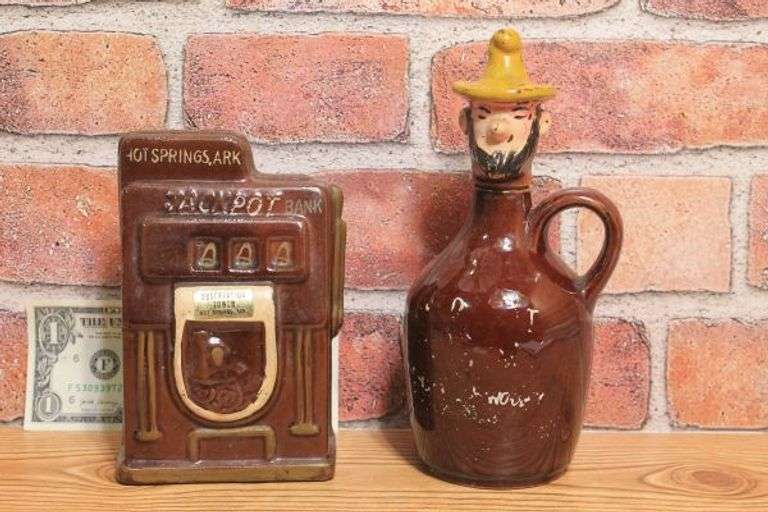 LOT 057 - Japan Hillbilly Top "Wild Juice" Ceramic Decanter and Hot Springs Arkansas Jackpot Bank with Stopper. W8A