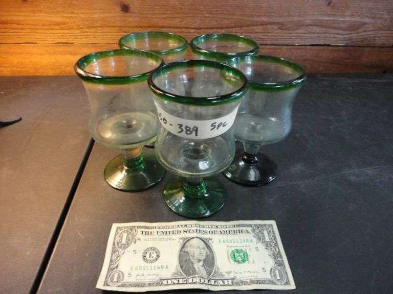 LOT 389 - SET OF 5 MEXICAN BLOWN GLASS GOBLET WITH GREEN RIM AND BASE