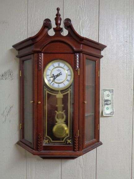 LOT 516 - Westminster / Whittington Quartz Clock w / Shelving for miniatures. ** cash only **. (room 7)