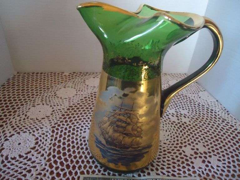 LOT 393 - Cash Only. Bohemian glass pitcher with clipper ship.