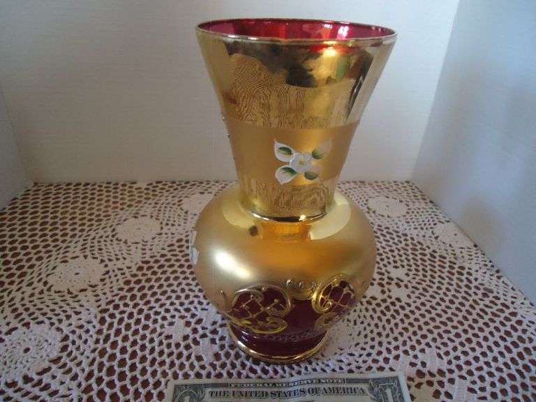LOT 392 - Cash Only. Vintage Bohemian painted red glass, gold accent 9" vase.