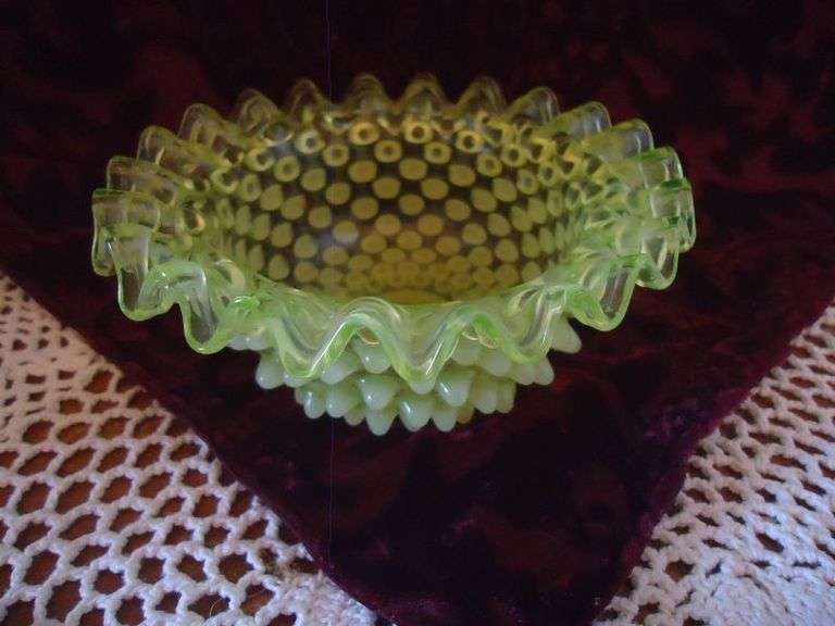 LOT 259 - Cash Only. Small Fenton opalescent hobnail yellow bowl, glows.