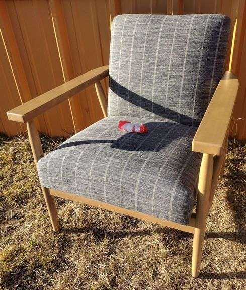 LOT 129 - Wooden armchair with fabric upholstered cushions - light wood with grey fabric - needs assembly