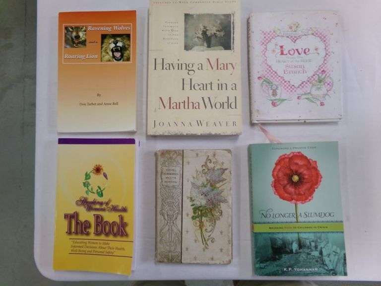 LOT 069 - Branch - "Love from the Heart of the Home", Speaking of Women's Health - "The Book", Havergal -"Royal Commandments for the King's Servants", Weaver - "Having a Mary Heart in a Martha World", Yohannan - "No Longer a Slumdog", and Tarbet & Bell - "Ravening Wolves and a Roaring Lion"