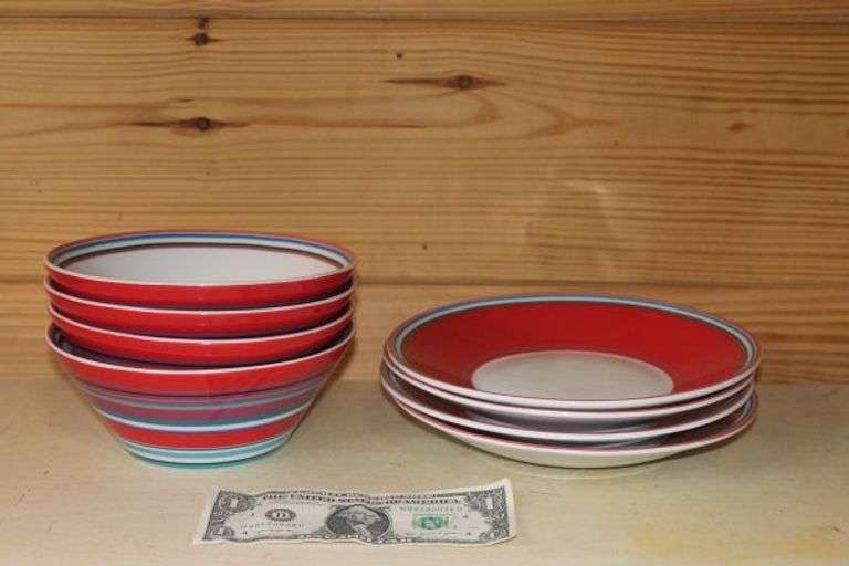 LOT 041 - DKNY Lenox Bright Striped Bowls and Salad Plates. Four of Each. Red