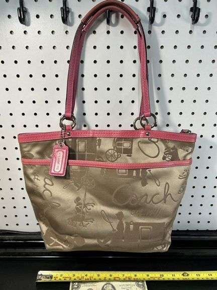 LOT 063 - Coach Pink & Tan Purse-11x9x5-zip top, front pouch-Very Clean!