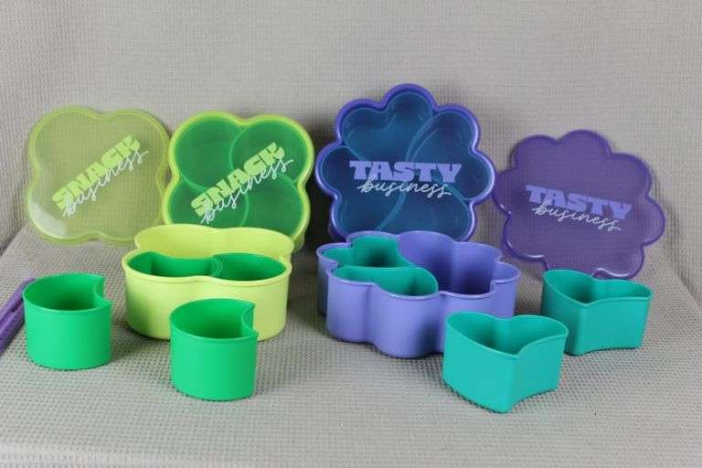LOT 218 - CASH ONLY New Snack and Tasty Business - Two Purple and Two Green Containers With Removable Inserts - Fill With Up To Four Different Things - The Kiddos Will Love These! (L3-4)