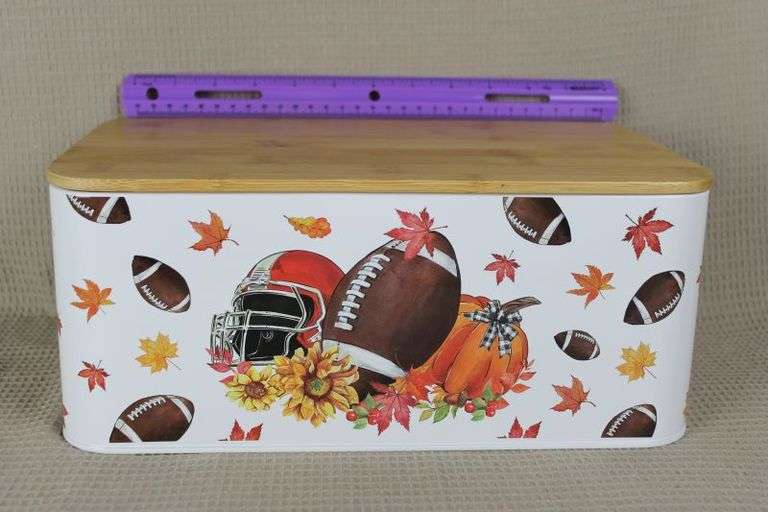 LOT 124 - CASH ONLY Just In Time For Football Season! Cute Tin With Wooden Lid (B1-3)
