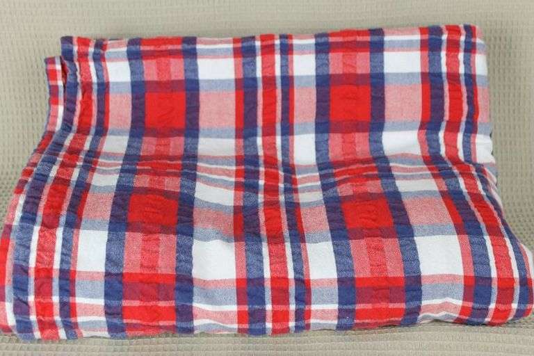 LOT 037 - CASH ONLY Red, White and Blue Plaid Tablecloth - 46x56 Looks New (B1-2)