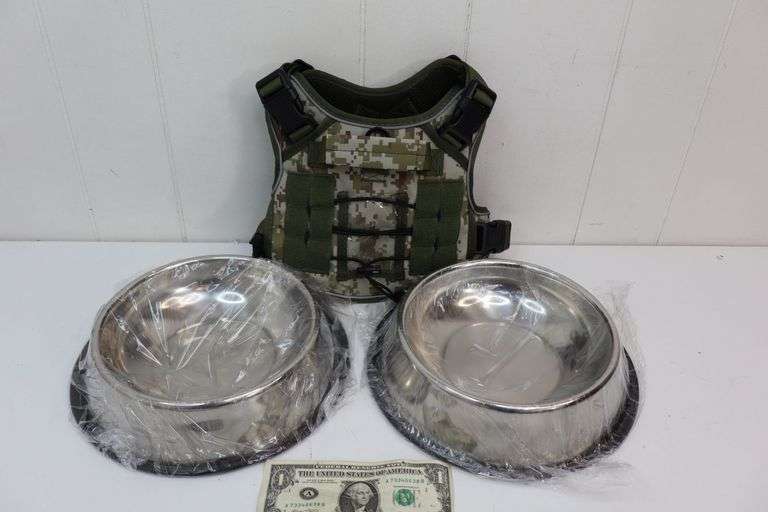 LOT 246 - Camo Dog Harness & 2PC Stainless Steel Dog Bowls Set! (T8)