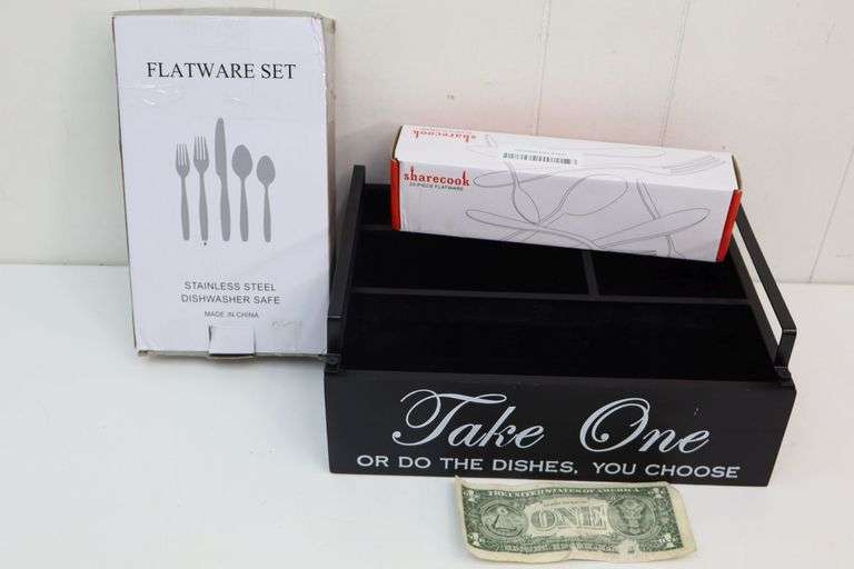 LOT 210 - Lot of TWO Stainless Steel Flatware Sets AND Cutlery/Utensil Rack! (T7)