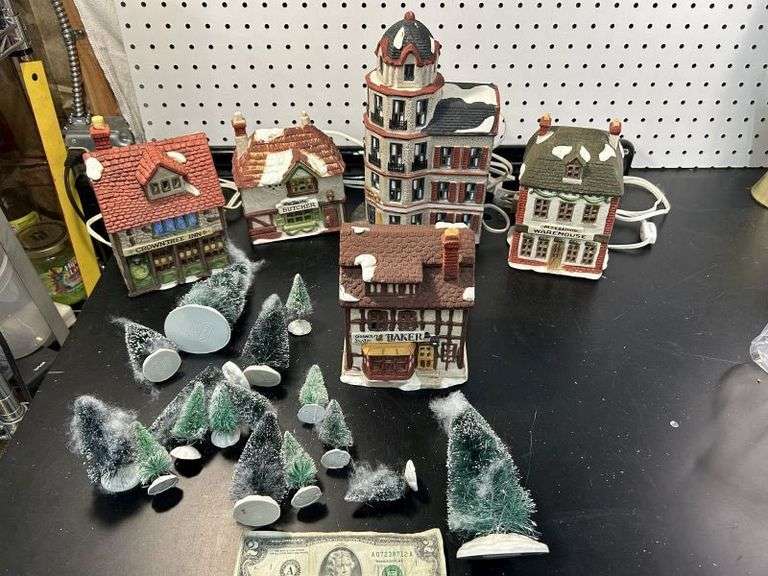 LOT 021 - Dept 56 Ceramic Village Pieces-4 w/light cords-1 w/o-no damage noted-Inn, Butchwer, Restaurant, Warehouse & Baker w/Trees(Lemax)!