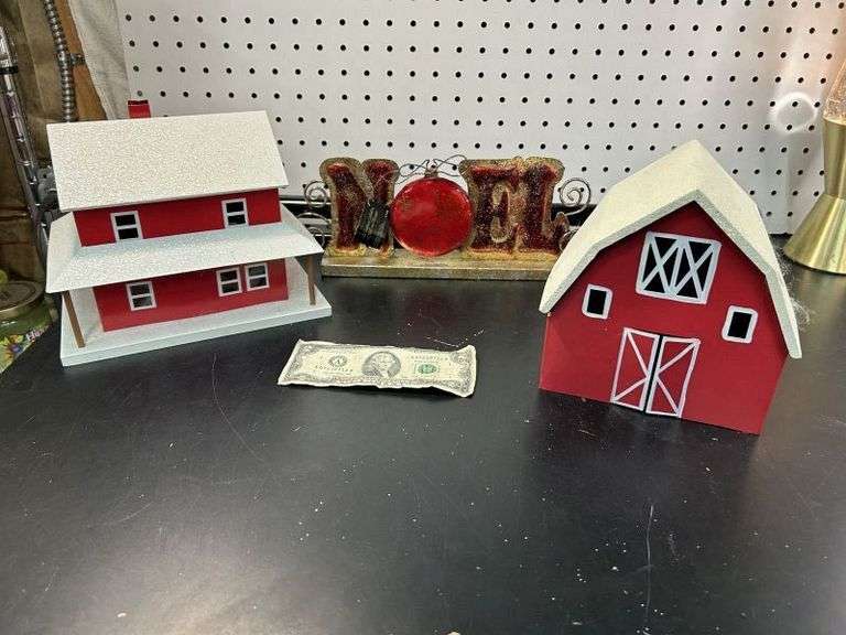 LOT 017 - Cute Tin Barn Xmas Village Décor & NOEL Metal Décor Plaque