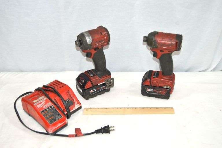 LOT 266 - MILWAUKEE DRILLS WITH BATTERIES & A BATTERY CHARGER - TESTED AND WORKS