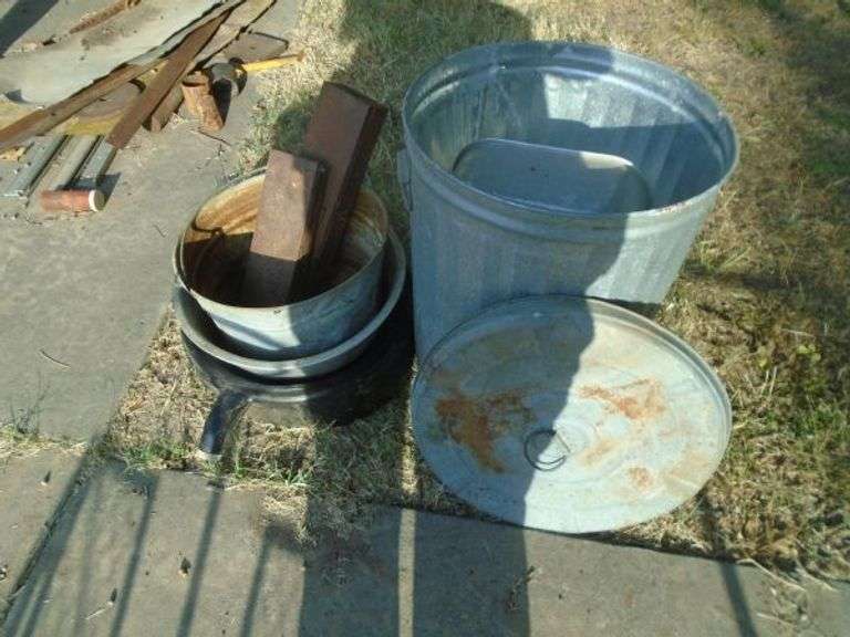 LOT 473 - Metal garbage can and lid, plastic oil changing, galvanized bucked, etc (BY) Cash Only